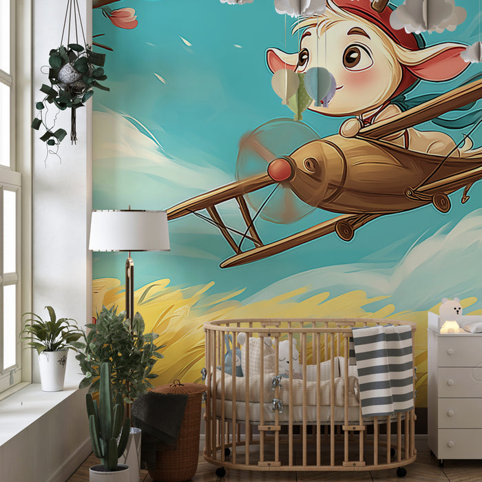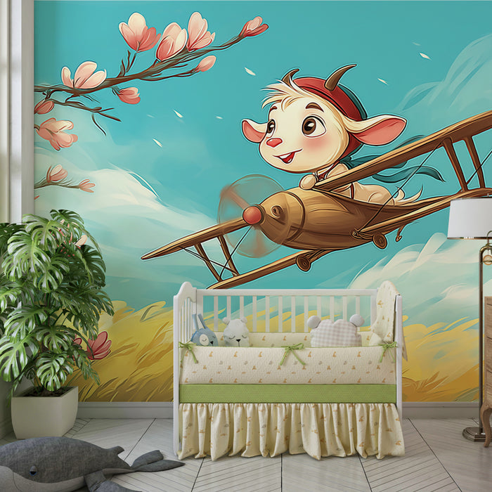 Kinderkamer behang | Kleine piloot in een bloemige lucht
