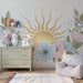 Babykamer behang | Delicate bloemen en stralende zon op een zachte achtergrond