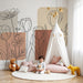 Beige en terracotta tinten voegen een subtiele warmte toe, waardoor deze ruimte uitnodigend en sereen wordt. Elk detail is zorgvuldig ontworpen om een minimalistische en verfijnde uitstraling te bieden, perfect om de verbeelding van je kleintje te stimuleren en tegelijkertijd een ontspannen omgeving te creëren.