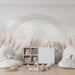 Transformeer de kamer van je baby in een dromerige ruimte met dit babykamerbehang, met zachte pastelkleurige kruiden en een rustgevende regenboog. De lichte en luchtige compositie creëert een serene sfeer, ideaal voor rustige en tedere momenten.