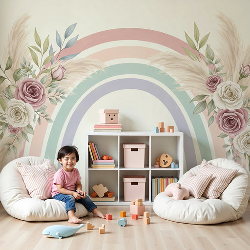 KidsWallTransformeer de kamer van je baby in een betoverende ruimte met dit babykamer behang dat een zachte regenboog omringd door prachtige bloemen illust...