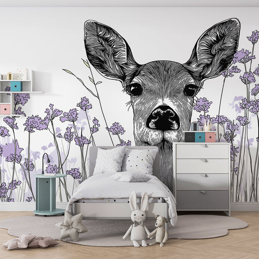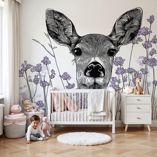 KidsWallTransformeer de kamer van je baby in een betoverende ruimte met dit babykamerbehang waarin een delicate hert te midden van lavendelbloemen te zien ...