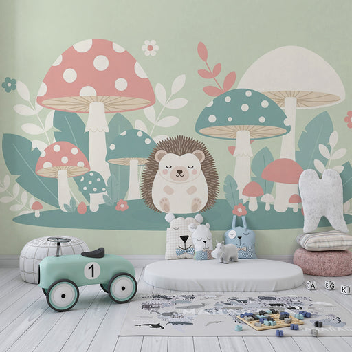 KidsWallTransformeer de kamer van je baby in een betoverende tuin met dit babykamerbehang met een schattige egel omringd door kleurrijke paddenstoelen. Zac...