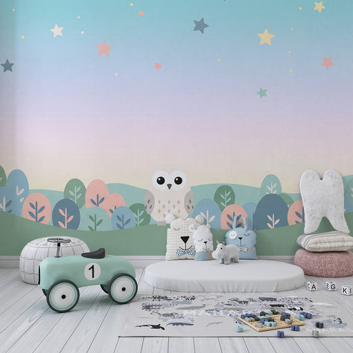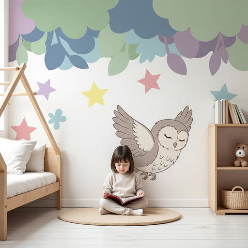 KidsWallTransformeer de kamer van uw baby in een zachte en betoverende omgeving met dit babykamer behang met een charmante uil die tussen kleurrijke sterre...