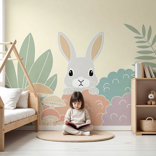 KidsWallTransformeer de kamer van je baby in een sprookjesachtige omgeving met dit babykamerbehang met een schattig konijn omringd door kleurrijke paddenst...