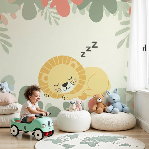 KidsWallTransformeer de kamer van je baby in een zachte oase met dit babykamerbehang met een rustig slapende leeuw. Omringd door weelderig bladgroen en del...