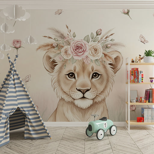 KidsWallTransformeer de kamer van uw baby in een betoverde tuin met dit babykamerbehang met een schattige leeuwenwelp met een bloemenkroon. Dit zachte en p...