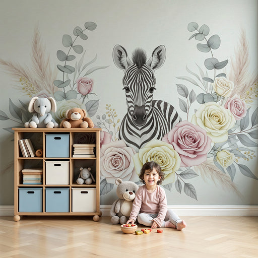 KidsWallTransformeer de kamer van uw baby in een betoverende ruimte met dit babykamerbehang dat een schattige zebra omringd door delicate bloemen en zachte...