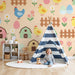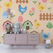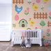 Babykamer behang | Charmante kippen en kleurrijke boerderij op een zachte achtergrond