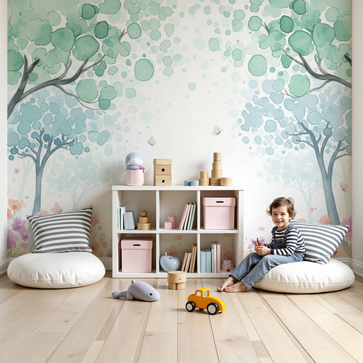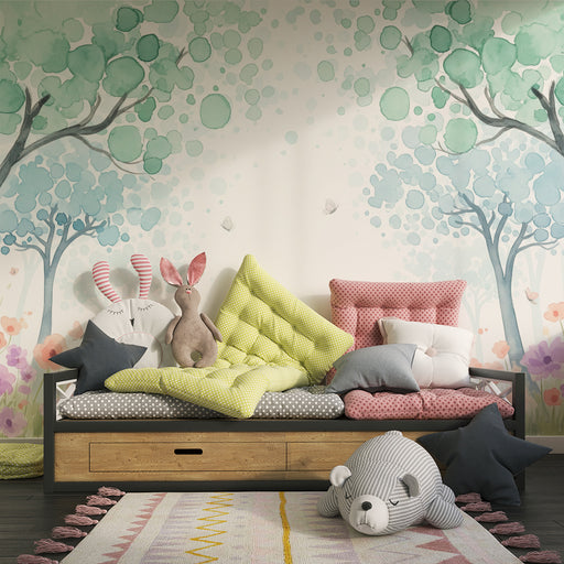 Babykamer behang | Gestileerde bomen in zachte kleuren voor een rustgevende sfeer