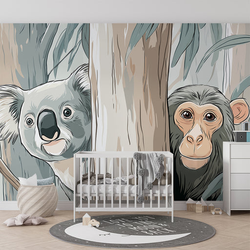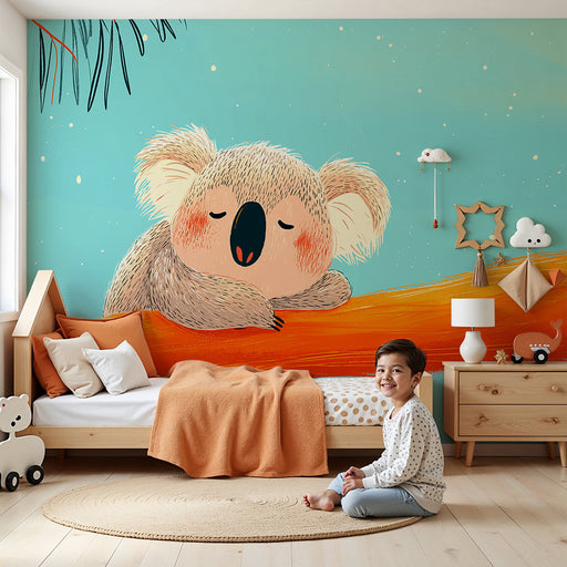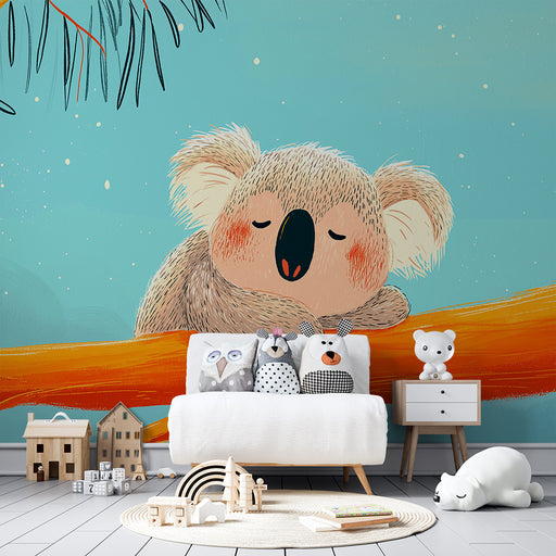 Breng zachtheid en sereniteit in de kamer van uw baby met deze babykamer behang die een schattige koala laat zien die vredig op een tak van eucalyp...