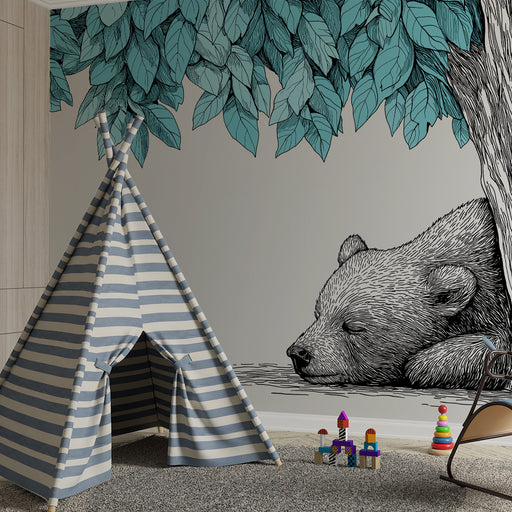 Babykamer behang | Slaperige beer onder rustgevend bladerdak