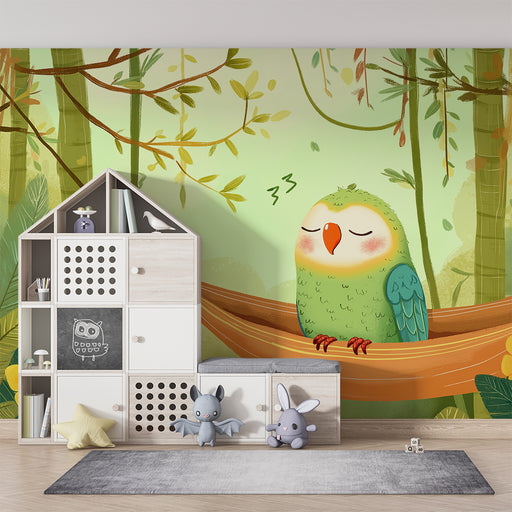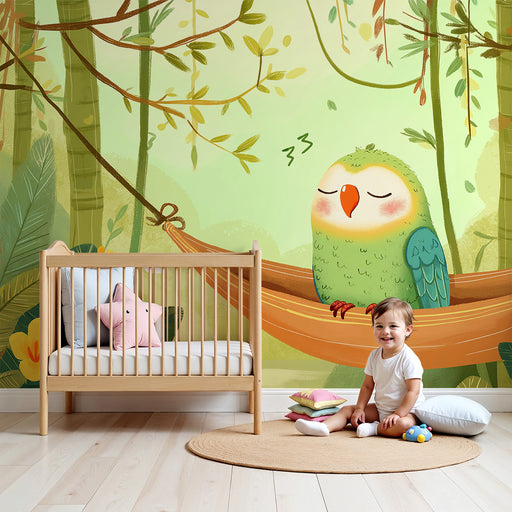 Transformeer de kamer van uw baby in een echt stukje natuur met dit babykamerbehang dat een schattige papegaai laat zien die in een hangmat rust. O...