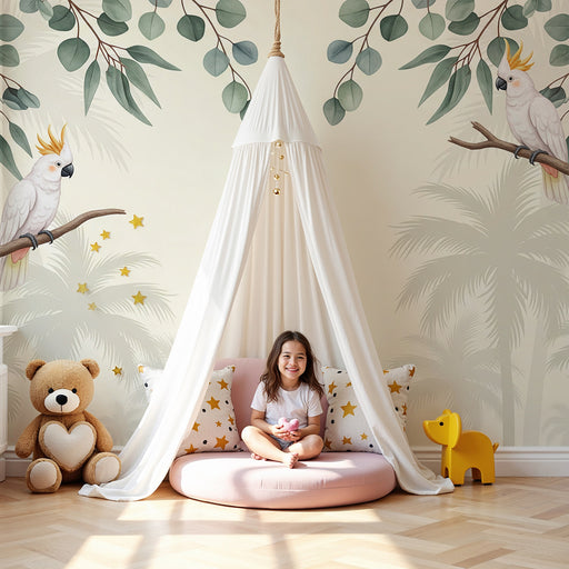 Bied uw kind een sprookjesachtige reis met dit kinderkamer behang dat hen naar een betoverde wereld brengt. Onder zacht licht dat door het geblader...