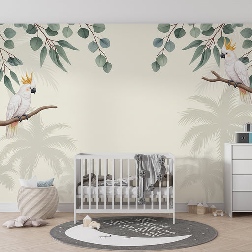 Babykamer behang | Elegante papegaaien zittend op takken met tropisch bladwerk