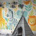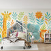 Transformeer de kamer van uw kind in een leuke wilde wereld met dit kinderbehang met schattige dieren uit de savanne. Een speelse giraf, een blauwe olifant, een gestreepte zebra en een lachende leeuw staan tussen weelderige vegetatie. Elk personage is getekend in felle kleuren en zachte vormen, waardoor een vrolijke en gastvrije sfeer ontstaat.
