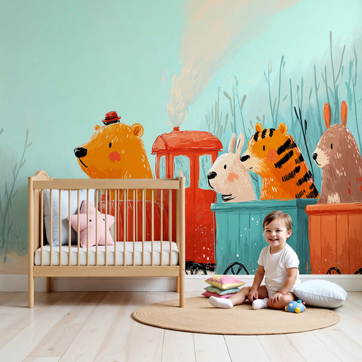 KidsWallTransformeer de kamer van uw kind in een magische reis met deze kinderkamer behang met een vrolijke groep dieren die reizen in een wagon. Een koala...