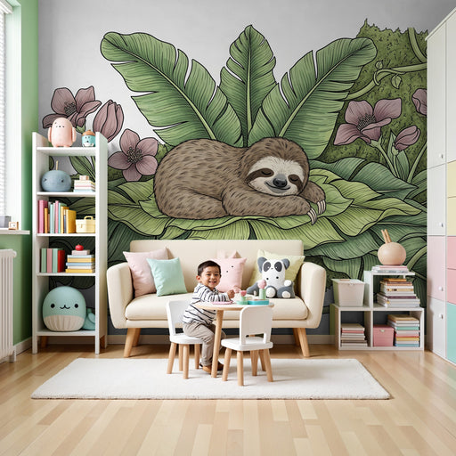 KidsWallRedecoreer de kamer van uw kind met dit kinderkamerbehang dat een schattige luiaard laat zien die rust op grote weelderige bladeren. Omringd door d...