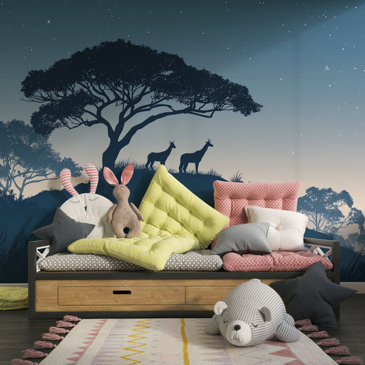 KidsWallTransformeer de kamer van uw kind in een rustig nachtelijk universum met dit kinderkamerbehang dat majestueuze silhouetten van herten op een heuvel...