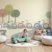 Transformeer de kamer van uw kind met deze kinderkamerbehang dat kleurrijke fietsen in een zonnig park afbeeldt. De pastelkleurige fietsen, variërend van groen tot roze, blauw en geel, voegen een vrolijke en dynamische touch toe aan de ruimte.