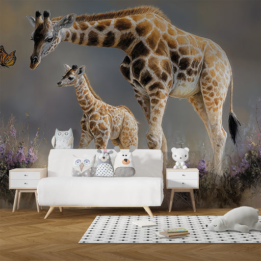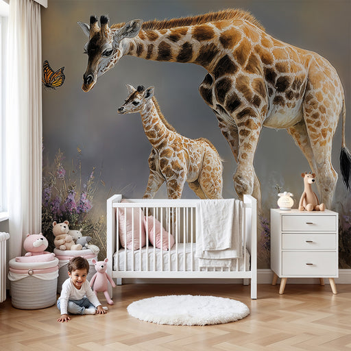 Papier peint chambre bébé | Girafes rêveuses et papillon délicat