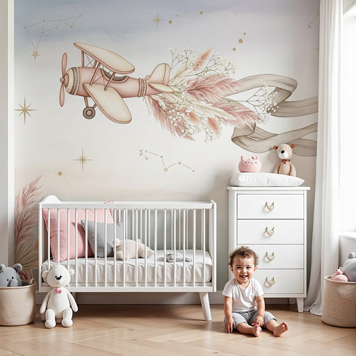 Alle gegevens bekijkenBabykamer behang | Vintage vliegtuig en delicate bloemen in een sterrenhemel