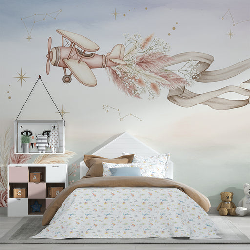 KidsWallEmbarquez pour un voyage féerique avec ce babykamer behang illustrant un charmant avion vintage survolant un ciel étoilé. Traînant derrière lui un ...
