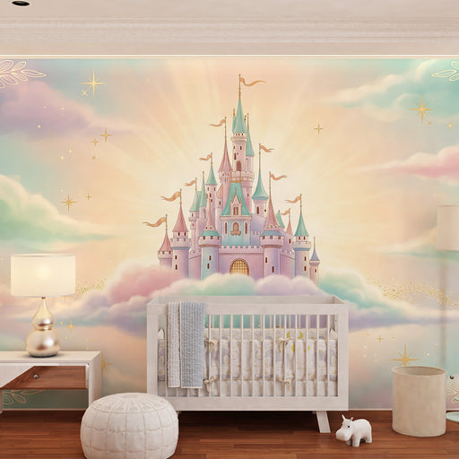 KidsWallTransformeer de kamer van je baby in een echt sprookje met dit babykamerbehang dat een majestueus kasteel toont dat zweeft tussen zachte pastelkleu...