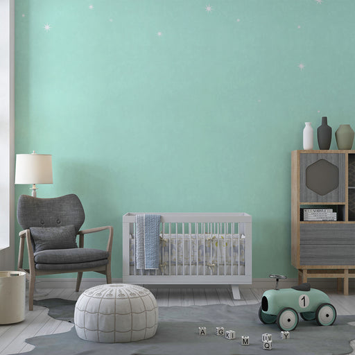 Alle gegevens bekijkenBabykamer behang | Sterrenhemel op rustgevende muntgroene achtergrond