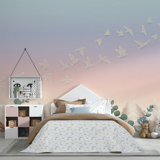Alle gegevens bekijkenBabykamer behang | Pastelblauwe lucht en vogels vliegen boven zachte vegetatie