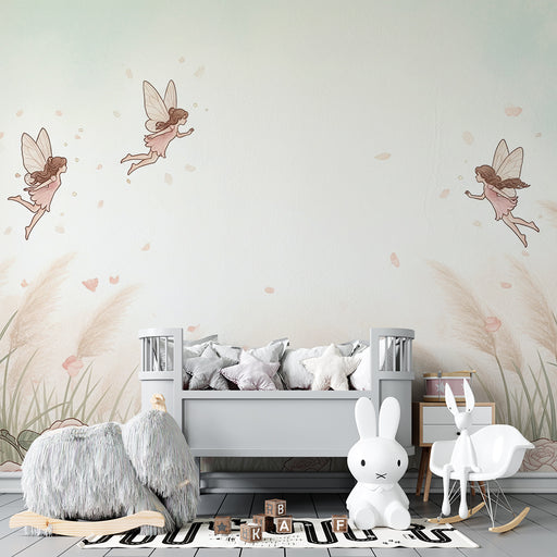 KidsWallDompel je onder in een betoverende wereld met dit babykamer behang dat de magie van feeën oproept. In een weelderige tuin dansen twee kleine feeën ...