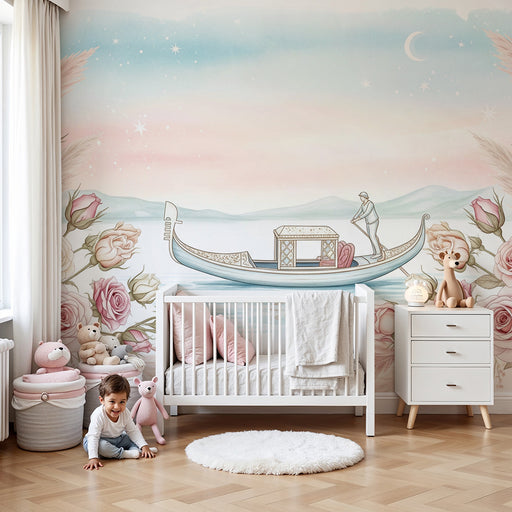 KidsWallTransformeer de kamer van uw baby in een zachte droom met deze babykamer behang die een rustige gondel laat zien die over rustig water glijdt. Omri...