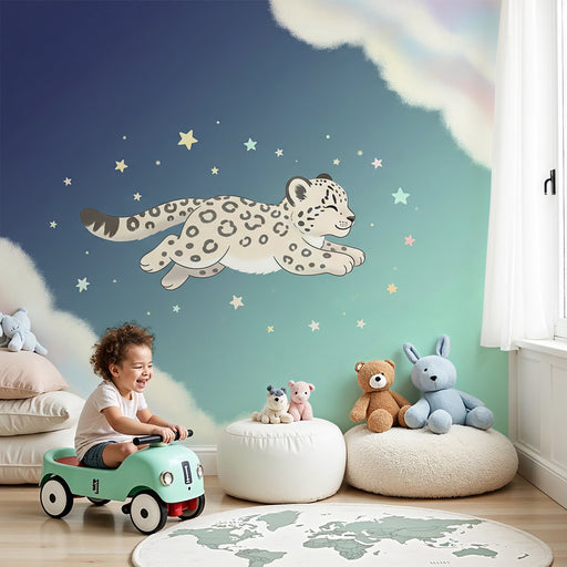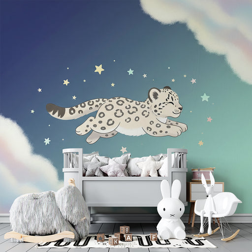 Alle gegevens bekijkenBabykamer behang | Sneeuwluipaard springend tussen de sterren
