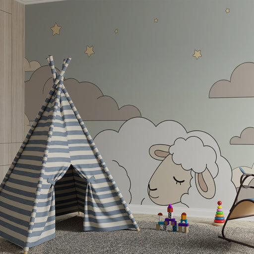 KidsWallBied uw kind een reis naar het hart van een magische lucht, waar dromen zweven tussen de sterren en gouden wolken. Dit babykamer behang transformee...