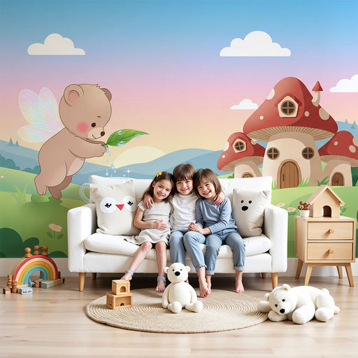 Alle gegevens bekijkenBabykamer behang | Feeërige beer die een kopje water geeft onder een pastelkleurige hemel