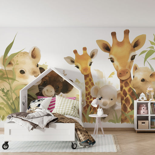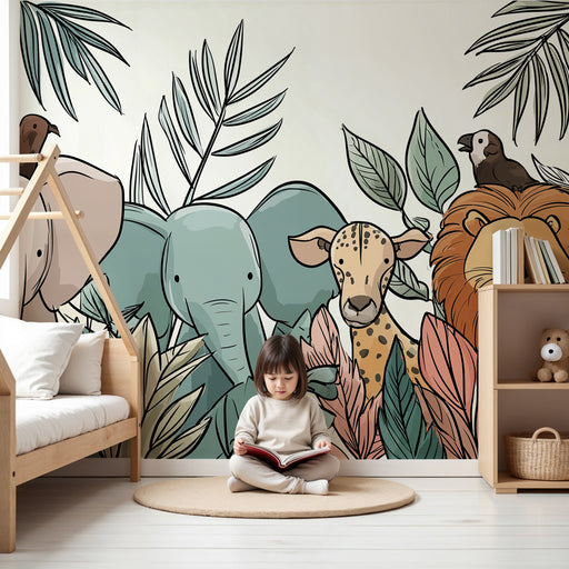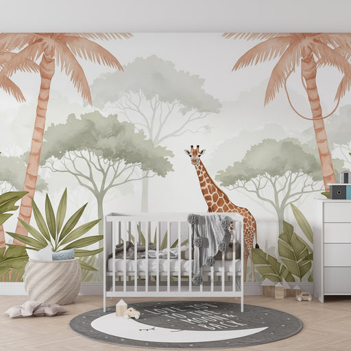KidsWallLaat uw kind naar het hart van de savanne reizen met dit kinderkamer behang dat uitnodigt tot ontsnapping. Tussen de tropische bladeren, majestueuz...