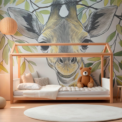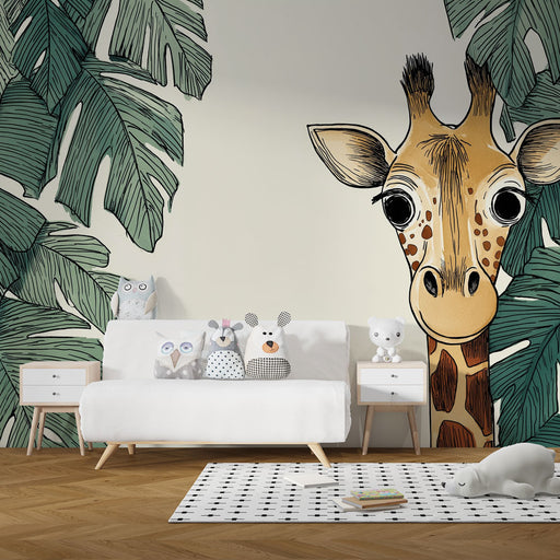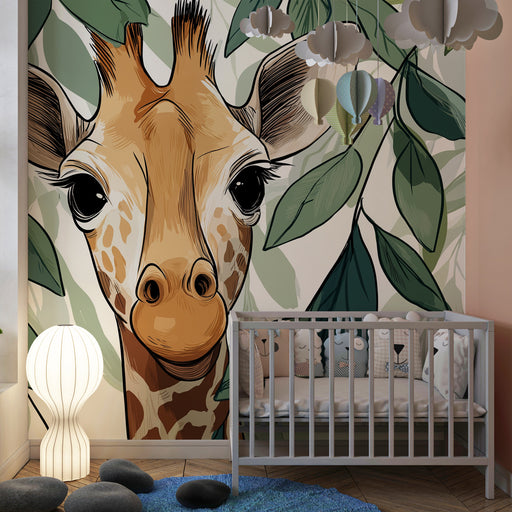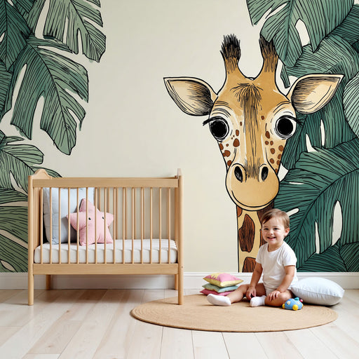 Alle gegevens bekijkenKinderkamer behang | Nieuwsgierige giraf tussen de bladeren