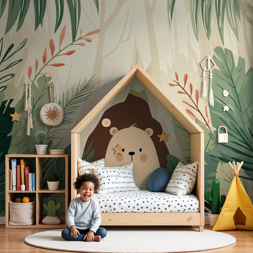 KidsWallDompel je baby onder in een speelse en levendige wereld met dit babykamer behang met een schattige beer in het hart van de jungle. Omringd door wee...