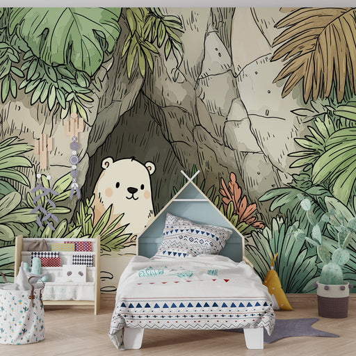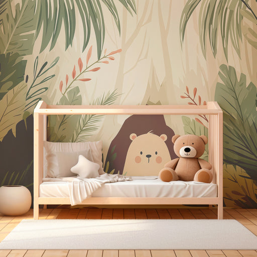 Alle gegevens bekijkenBabykamer behang | Nieuwsgierige beer in de jungle