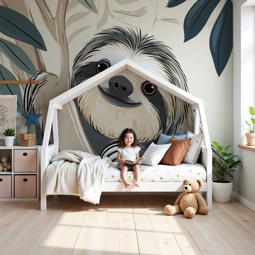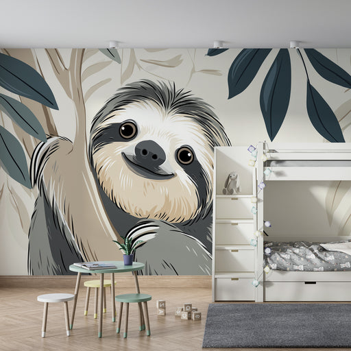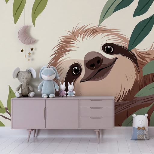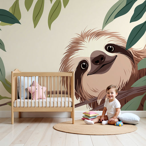 KidsWallCreëer een warme en leuke omgeving voor je baby met dit babykamerbehang met een schattige luiaard die aan een tak hangt. Zijn aanstekelijke glimlac...