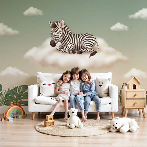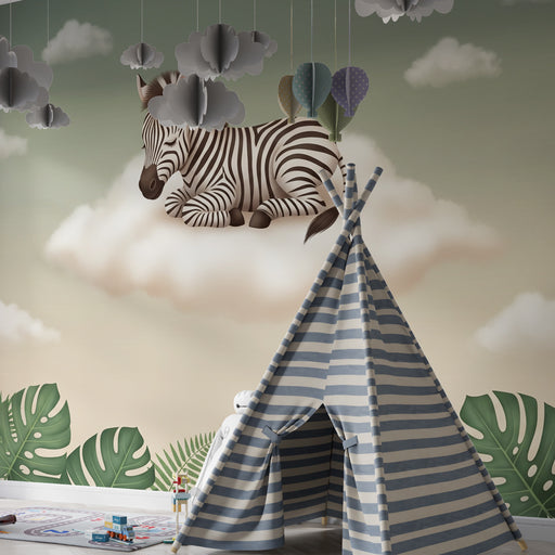 KidsWallGeef de kamer van je baby een vleugje zachtheid en dromerigheid met dit babykamerbehang met een rustig zittende zebra op een zachte wolk. De rustge...