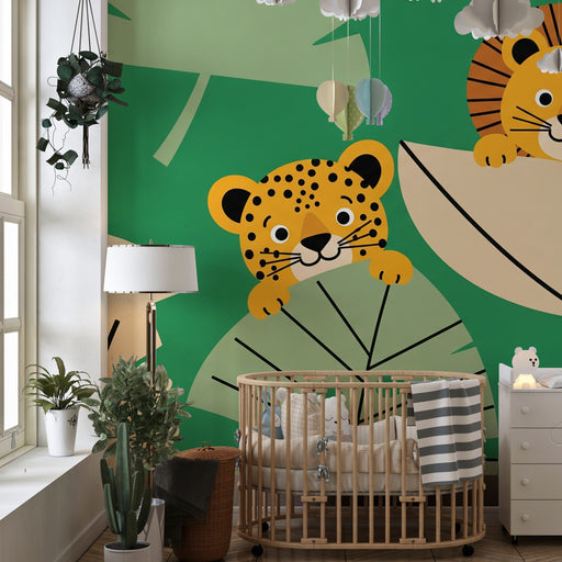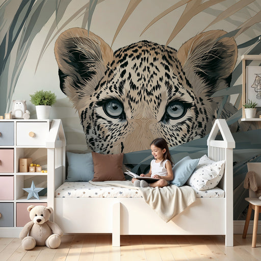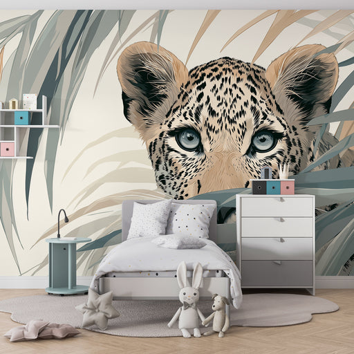 KidsWallDompel je onder in de wilde en fascinerende wereld met dit kinderbehang dat een jonge luipaard laat zien die zachtjes opduikt uit weelderige blader...