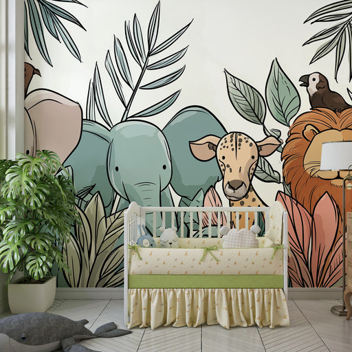 Alle gegevens bekijkenBabykamer behang | Leuke dieren in een speelse jungle