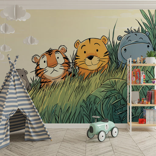 KidsWallDompel je kind onder in een wereld van avontuur met dit ondeugende kinderkamerbehang met jungle dieren. Een schattige oranje tijger en zijn lachend...