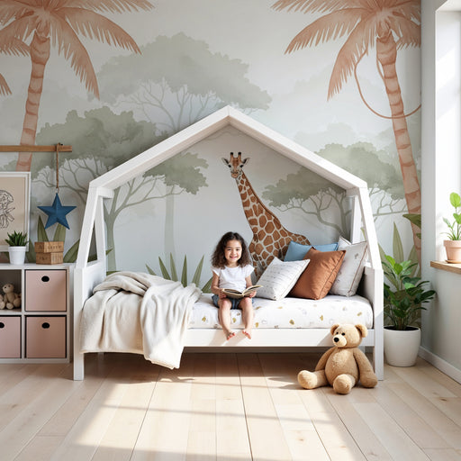 KidsWallBied uw kind een open venster naar de savanne met dit kinderkamer behang dat de majesteit en zachtheid van giraffen vastlegt in een weelderige omge...
