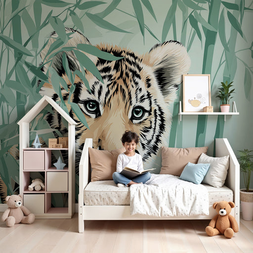 KidsWallTransformeer de kamer van uw kind in een echt natuurlijk toevluchtsoord met dit kinderbehang met een geliefde jonge tijger verstopt tussen weelderi...