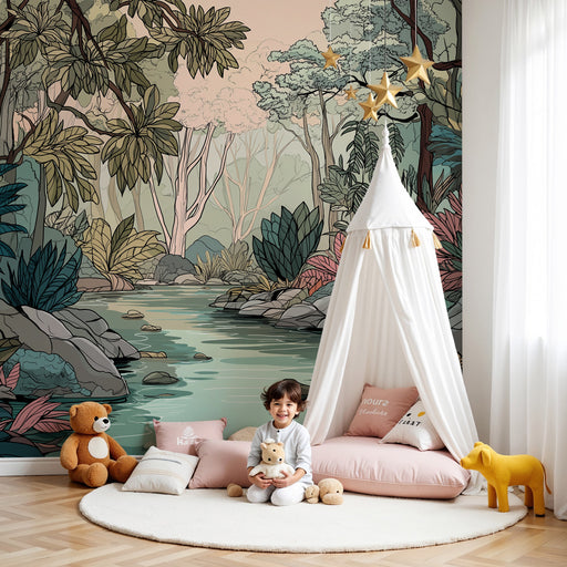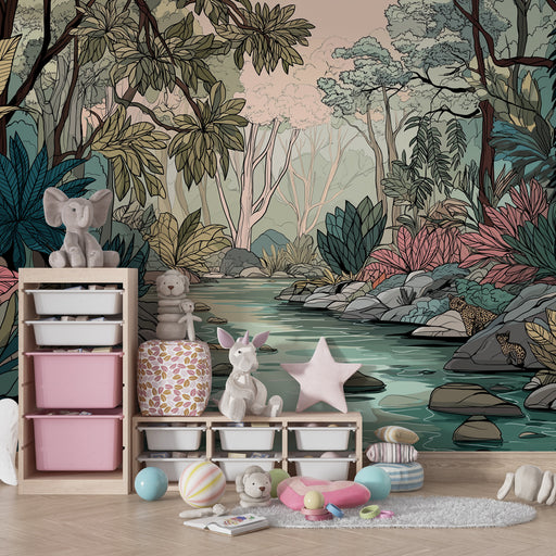 KidsWallTransformeer de kamer van uw kind in een tropisch paradijs met dit prachtige kinderbehang. Duik in een rustgevende sfeer waar een fonkelende rivier...