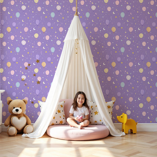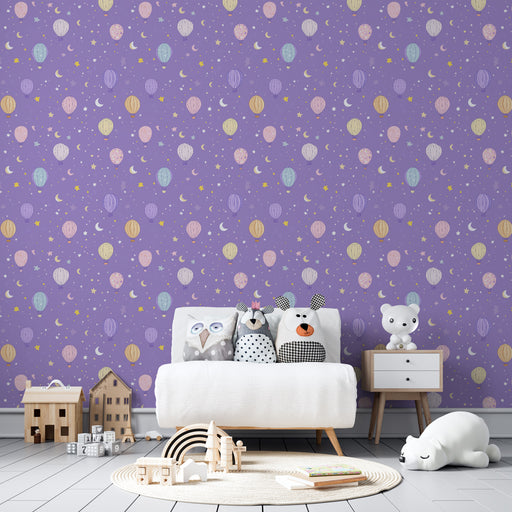 Alle gegevens bekijkenKinderkamer behang met motieven | Kleurrijke luchtballonnen en sterrenhemel op een paarse achtergrond
