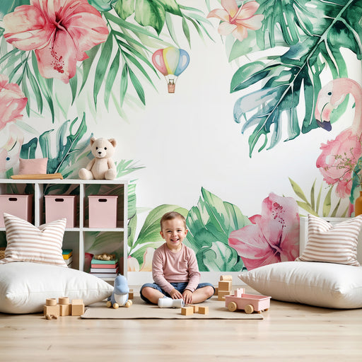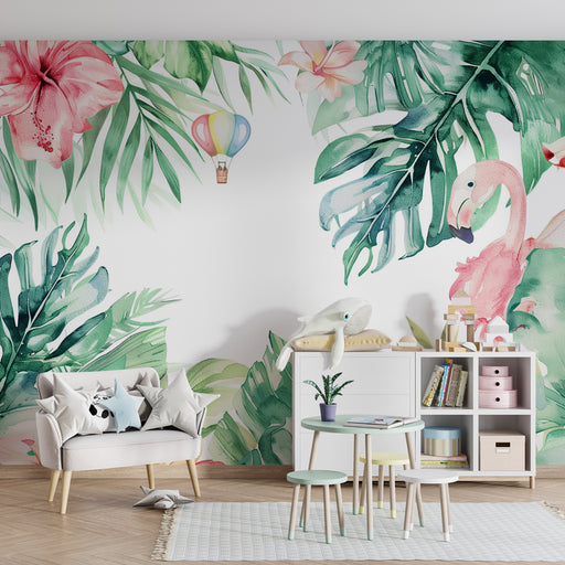 Alle gegevens bekijkenKinderkamer behang | Tropische ontsnapping met roze flamingo's en kleurrijke luchtballon