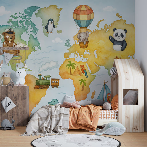 KidsWallCe dierenkaart behang biedt een denkbeeldige reis rond de wereld voor kinderen, met schattige illustraties van verschillende dieren zoals een panda...